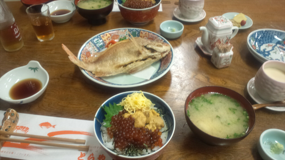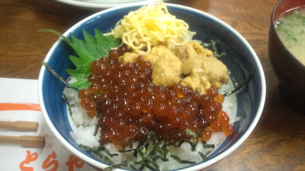 コースの下見が終ると、晩飯へ。「とらや」というお店でうにイクラ丼なんかをたべてしまいました。めちゃめちゃうまかった!